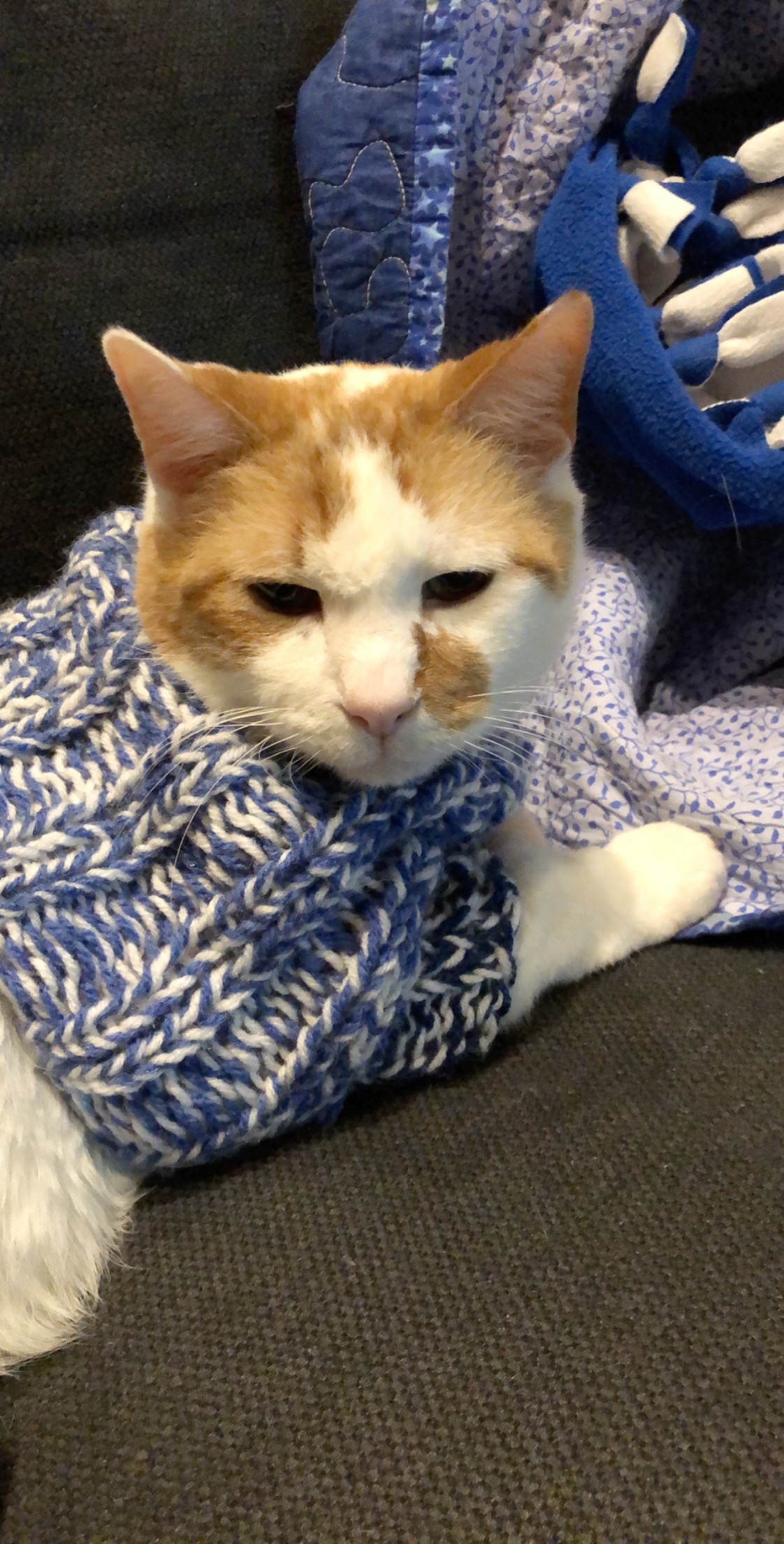 But now a new problem arose. With the oozing of the wound, I needed to change his clothes every so often to keep the infection from getting worse and to wash the one he was previously wearing. One out of the five onesies I had bought didn’t seem to offend him, but the sweater definitely fit the best… So the needles kept flying through a dense fog of coffee, pu-erh, and delivery pizza until I finished another cat-tastic sweater.