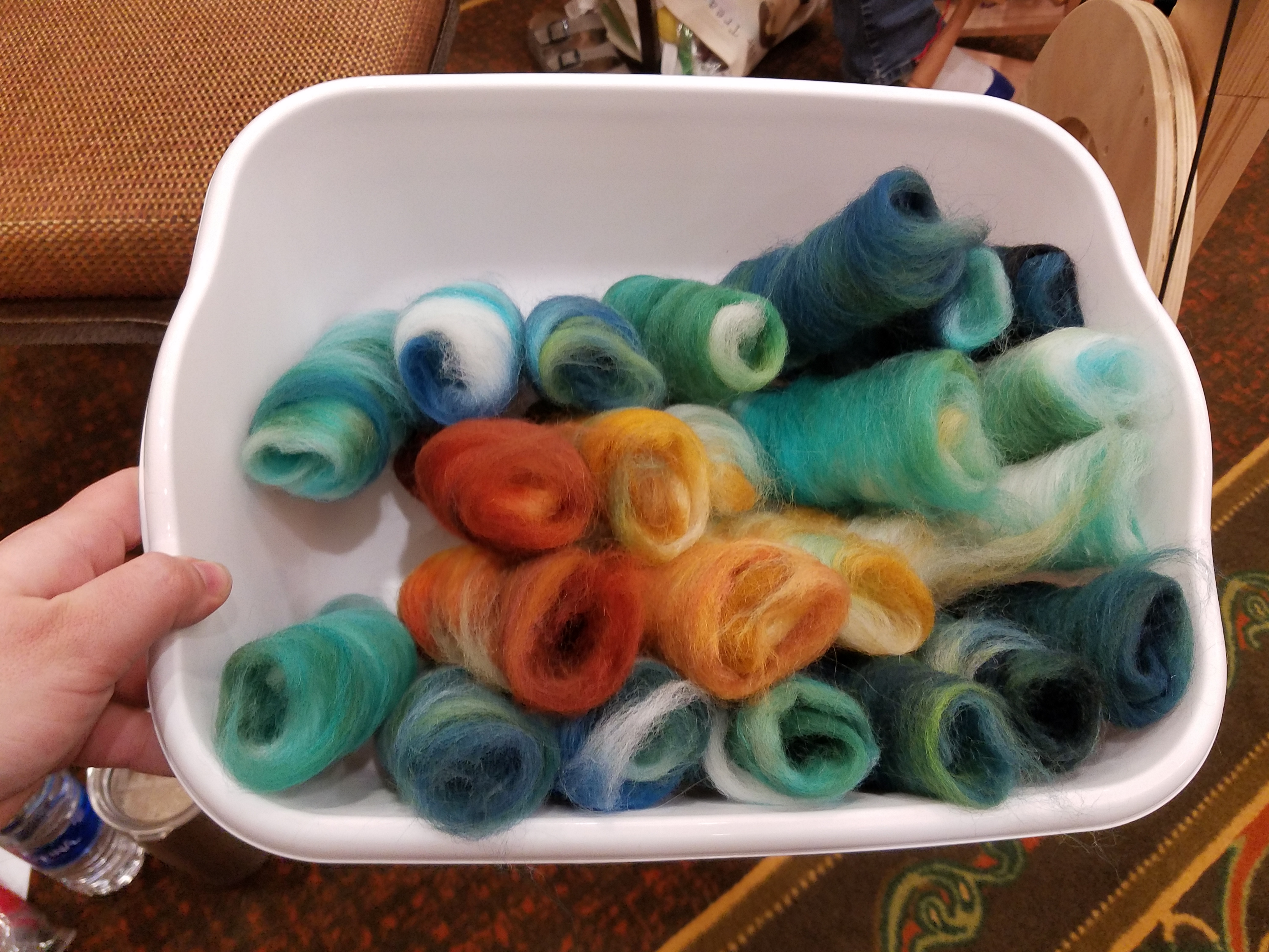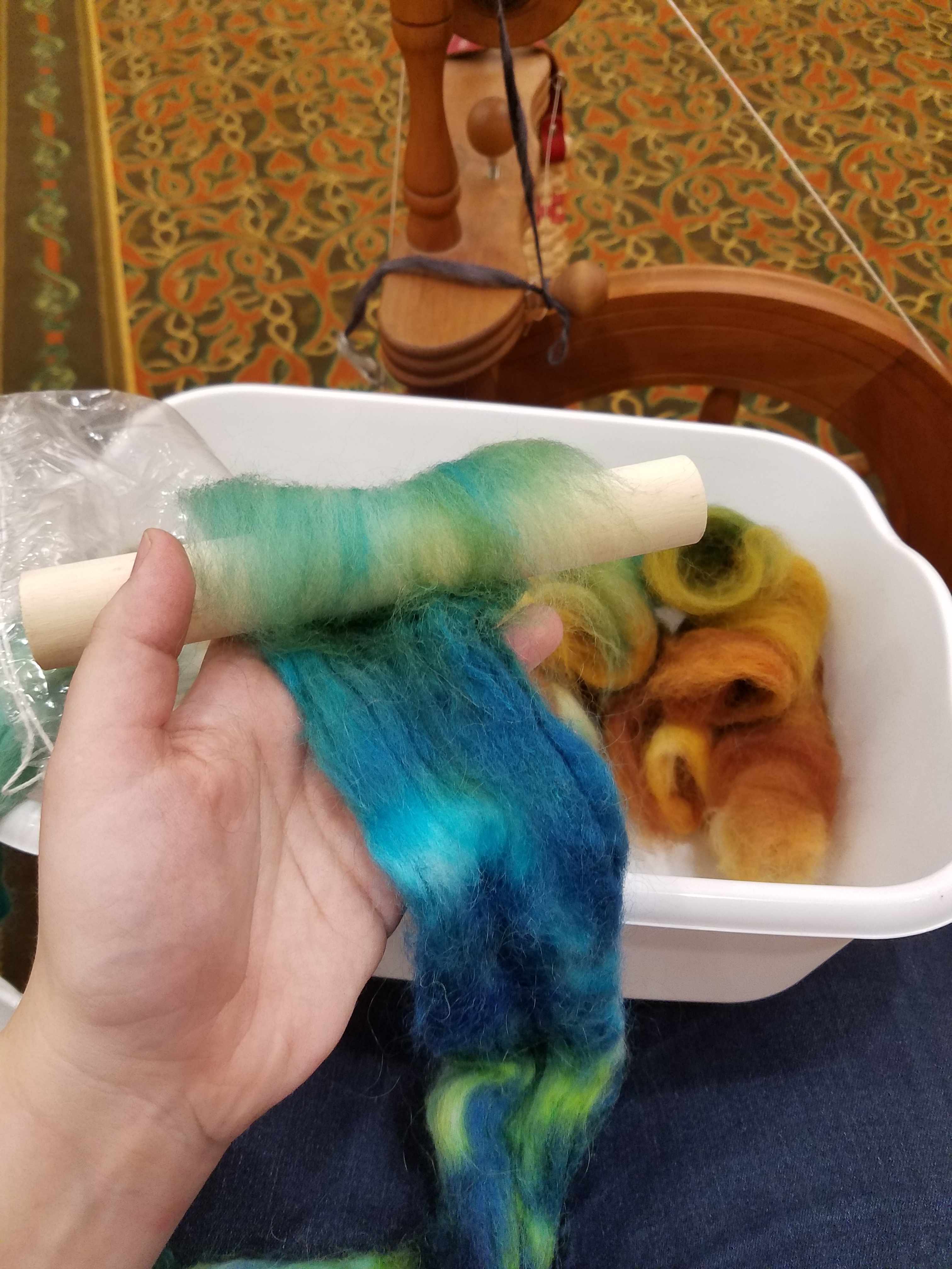 Fauxlags are a fun way to prepare a combed top that gives you a little more control over your yarn. You roll the top around a dowel, pull off a staple length, and continue to roll until it’s a nice, round “rolag.” We had hand-dyed top from Hello Yarn to work with, and most of us decided to arrange the colors into gradients.