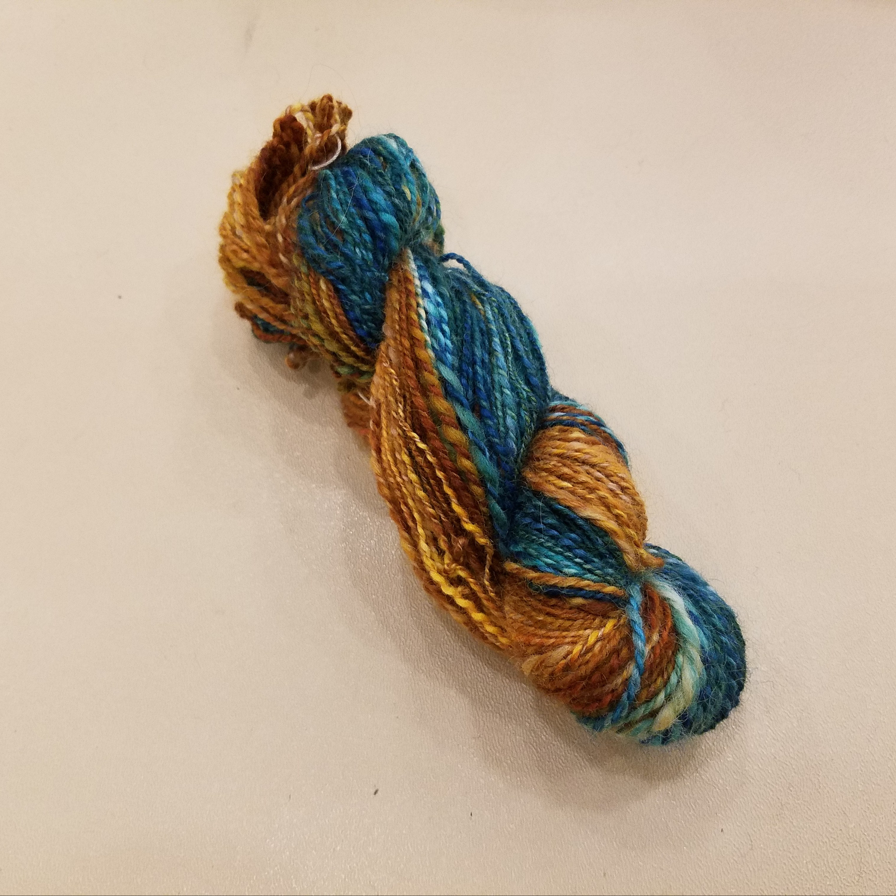 So you spin these two lengths of top, one thick and one skinny. This creates long color changes on one ply and shorter changes on another, like my “plies” below. The finished yarn really showcases all of the colors.