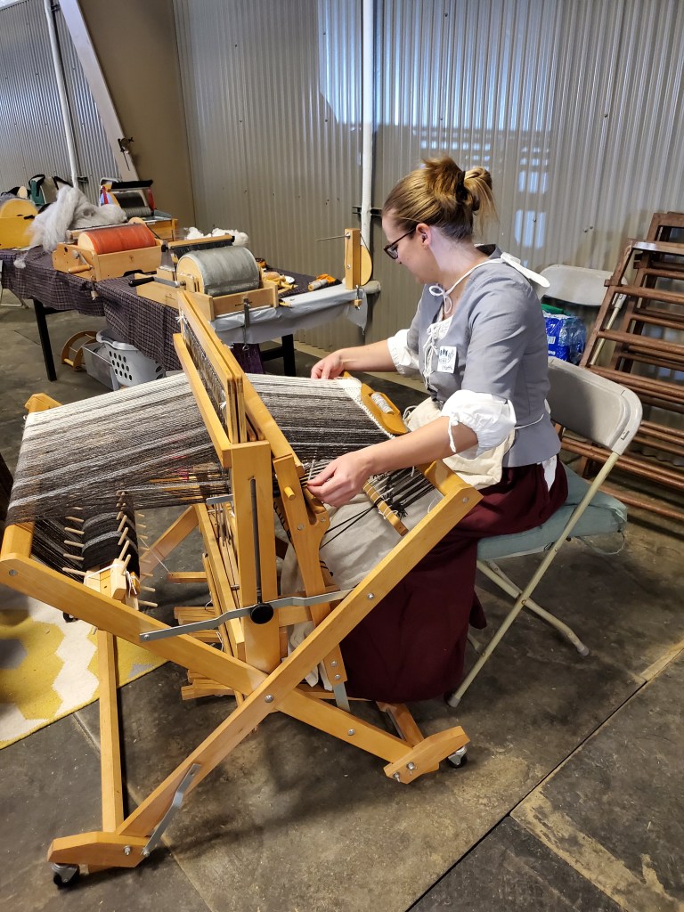 In the barn where they were showing sheep, the festival hosted a Sheep-to-Shawl competition! Three groups prepared wool from a local sheep, spun it, and wove a shawl as quickly as they could. The winners get ribbons and bragging rights for a year. This team dressed as their favorite literary spinners and took frequent singing breaks. They utilized all the colors in a Jacob fleece to make a gorgeous twill shawl. To say I was enthralled is an understatement.