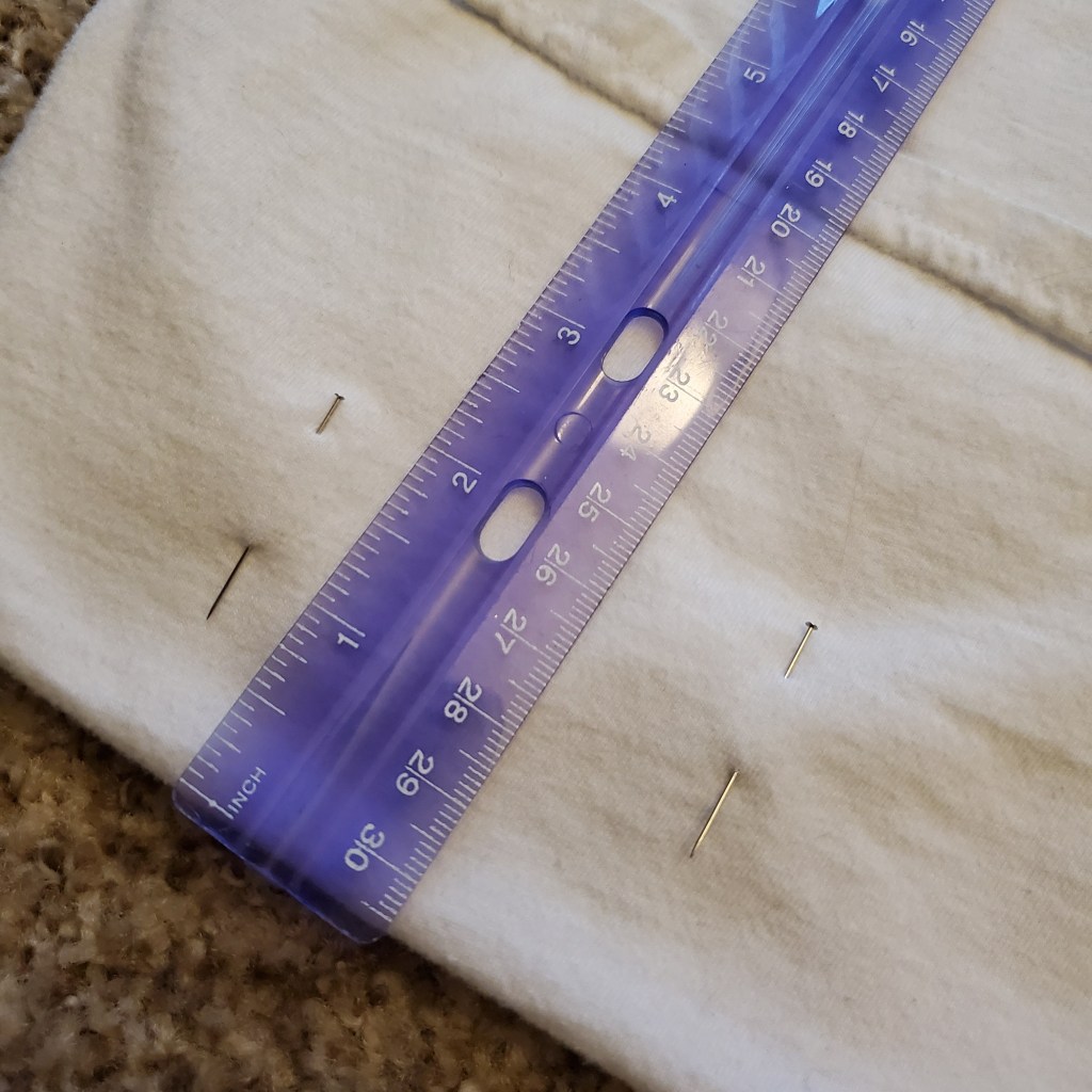 I turned the shirt inside out, and rolled the bottom hem up the shirt at five inches around (or as close as I could, the shirt was cut to be a bit longer on the sides) and pinned it in place.