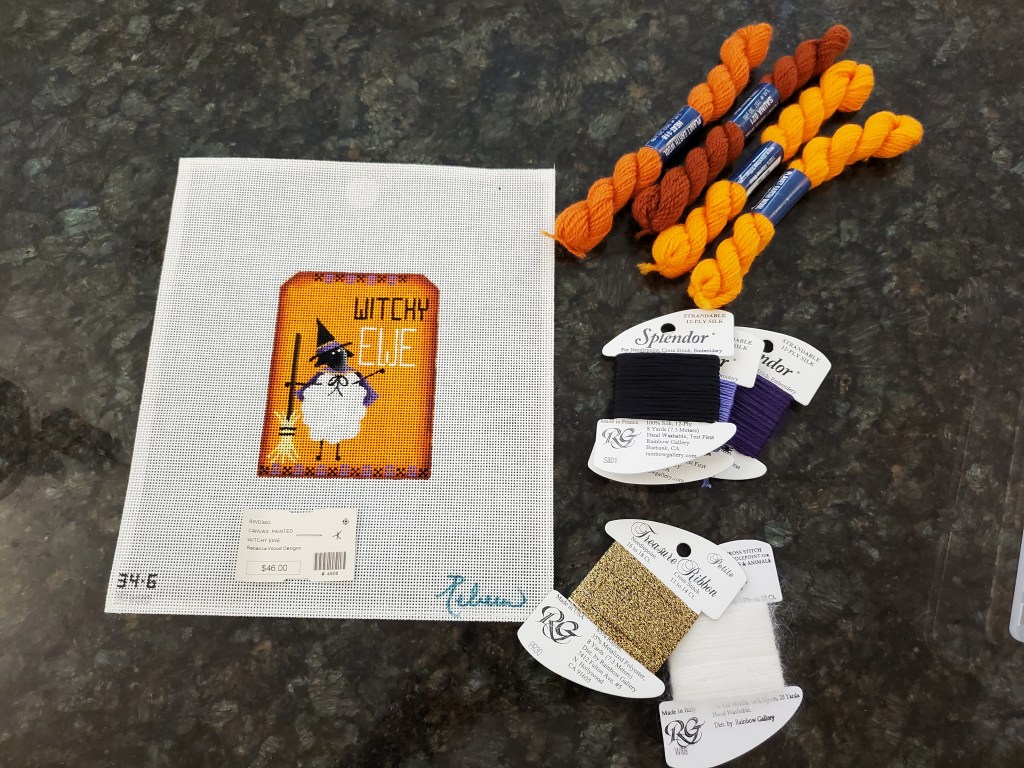 Long-time readers know I like to buy local stuff when I travel. That’s a little bit harder to do in a needlepoint shop, and even harder when you don’t feel up to stitching what they do have. So, mildly defeated, I did thumb through their Rebecca Wood trunk show. When I found this canvas, I made such a noise, it concerned the ladies working the shop…