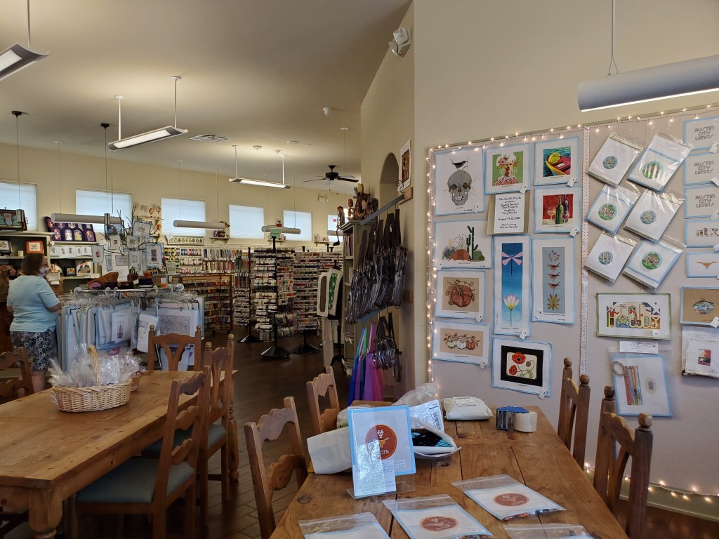 I did make it down to Austin with my dad (projects in tow). The first day we were in town, I was feeling antsy and decided I needed to get out over my lunch hour. I looked at places I could walk to get lunch… and then I looked to see if there were any local craft shops around. Sure enough, my aunt lives walking distance from a needlepoint shop! After checking that COVID precautions were in place, I set out.